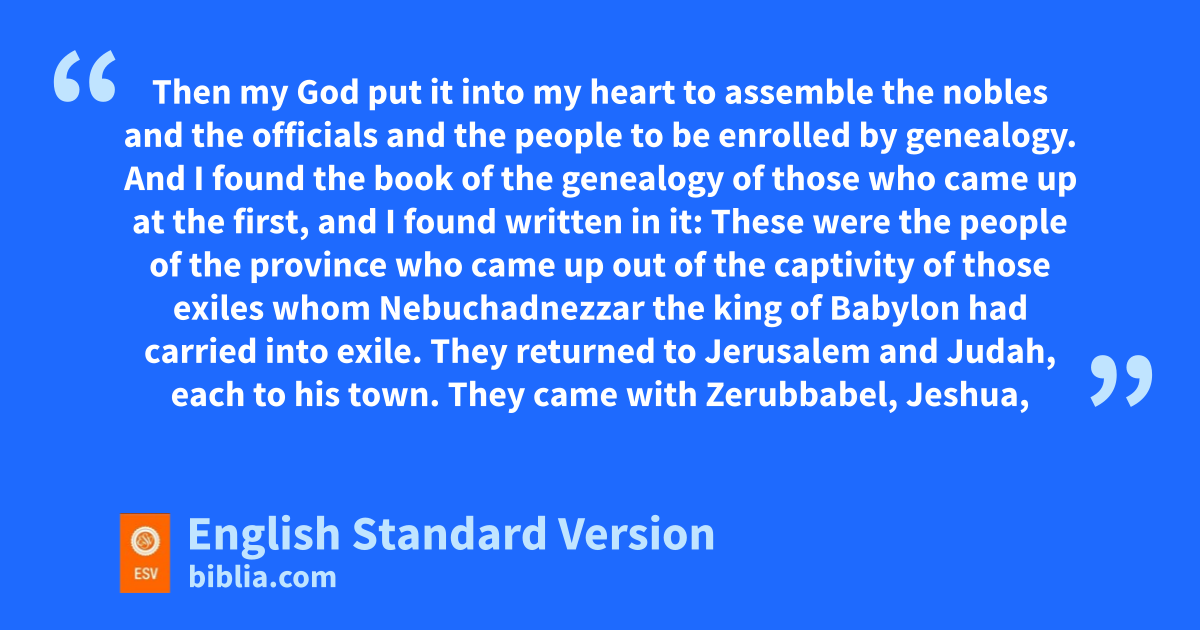 5 Then my God put it into my heart to assemble the nobles and the officials and the people to be enrolled by genealogy. And I found the book of the genealogy of rthose who came up at the first, and I found written in it: