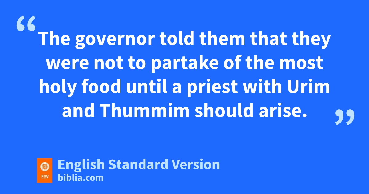 61 nThe following were those who came up from Tel-melah, Tel-harsha, Cherub, oAddon, and Immer, but they could not prove their fathers’ houses nor their descent, whether they belonged to Israel: 62 the sons of Delaiah, the sons of Tobiah, the sons of Nekoda, 642. 63 Also, of the priests: the sons of Hobaiah, the sons of Hakkoz, the sons of Barzillai (who had taken a wife of the daughters of Barzillai the Gileadite and was called by their name). 64 These sought their registration among those enrolled in the genealogies, but it was not found there, so they were excluded from the priesthood as unclean. 65 pThe qgovernor told them that they were not to partake of the most holy food until a priest with Urim and Thummim should arise.