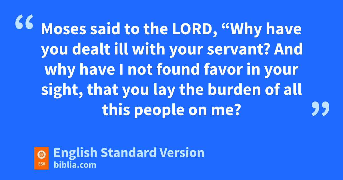 10 Moses heard the people hweeping throughout their clans, everyone at the door of his tent. And the anger of the Lord blazed hotly, and Moses was displeased. 11 iMoses said to the Lord, “Why have you dealt ill with your servant? And why have I not found favor in your sight, that you lay the burden of all this people on me? 12 Did I conceive all this people? Did I give them birth, that you should say to me, j‘Carry them in your bosom, as a knurse carries a nursing child,’ to the land lthat you swore to give their fathers? 13 mWhere am I to get meat to give to all this people? For they weep before me and say, ‘Give us meat, that we may eat.’ 14 nI am not able to carry all this people alone; the burden is too heavy for me. 15 If you will treat me like this, kill me at once, if I find favor in your sight, that I may not see my wretchedness.”