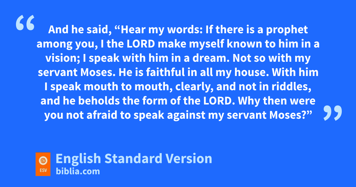 12 Miriam and Aaron spoke against Moses because of the Cushite woman whom he had married, for he had married a Cushite woman. 2 And they said, “Has the Lord indeed spoken only through Moses? oHas he not spoken through us also?” And pthe Lord heard it. 3 Now the man Moses was very meek, more than all people who were on the face of the earth. 4 And suddenly the Lord said to Moses and to Aaron and Miriam, “Come out, you three, to the tent of meeting.” And the three of them came out. 5 And qthe Lord came down in a pillar of cloud and stood at the entrance of the tent and called Aaron and Miriam, and they both came forward. 6 And he said, “Hear my words: If there is a prophet among you, I the Lord make myself known to him rin a vision; I speak with him sin a dream. 7 Not so with tmy servant Moses. uHe is faithful in all my house. 8 With him I speak vmouth to mouth, clearly, and not in wriddles, and he beholds xthe form of the Lord. Why then were you not afraid to speak against my servant Moses?” 9 And the anger of the Lord was kindled against them, and he departed.
