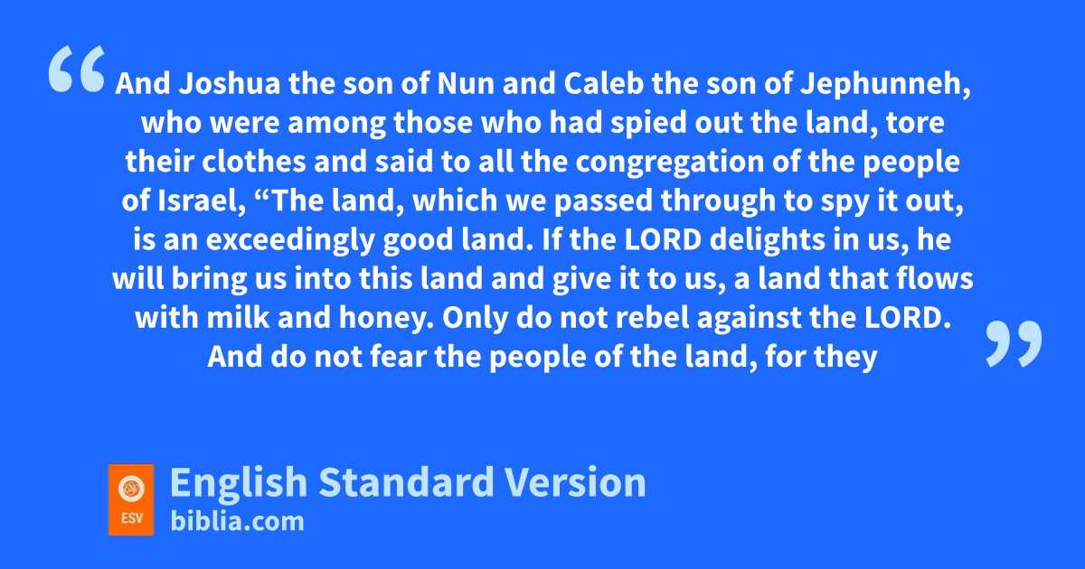 5 Then oMoses and Aaron fell on their faces before all the assembly of the congregation of the people of Israel. 6 pAnd Joshua the son of Nun and Caleb the son of Jephunneh, who were among those who had spied out the land, tore their clothes 7 and said to all the congregation of the people of Israel, q“The land, which we passed through to spy it out, is an exceedingly good land. 8 If rthe Lord delights in us, he will bring us into this land and give it to us, sa land that flows with milk and honey. 9 Only tdo not rebel against the Lord. And udo not fear the people of the land, for vthey are bread for us. Their protection is removed from them, and the Lord is with us; do not fear them.” 10 wThen all the congregation said to stone them with stones. But xthe glory of the Lord appeared at the tent of meeting to all the people of Israel.
