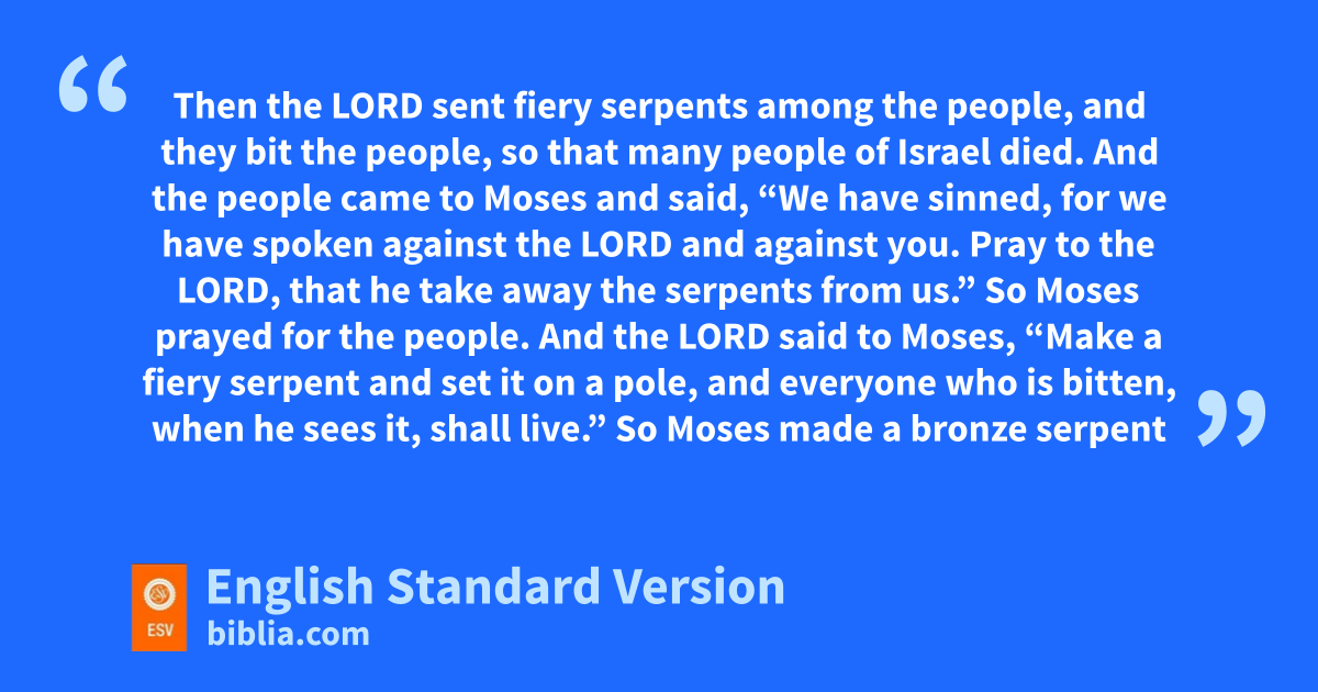 4 From Mount Hor athey set out by the way to the Red Sea, bto go around the land of Edom. And the people became impatient on the way. 5 And the people cspoke against God and against Moses, d“Why have you brought us up out of Egypt to die in the wilderness? For there is no food and no water, and ewe loathe this worthless food.” 6 fThen the Lord sent fiery serpents among the people, and gthey bit the people, so that many people of Israel died. 7 hAnd the people came to Moses and said, “We have sinned, for we have spoken against the Lord and against you. iPray to the Lord, that he take away the serpents from us.” So Moses prayed for the people. 8 And the Lord said to Moses, “Make a fiery serpent and set it on a pole, and everyone who is bitten, when he sees it, shall live.” 9 So jMoses made a bronze3 serpent and set it on a pole. And if a serpent bit anyone, he would look at the bronze serpent and live.