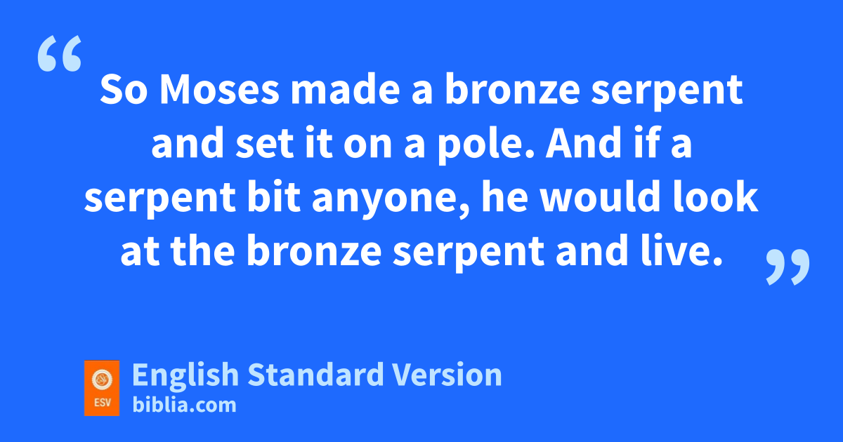 4 From Mount Hor athey set out by the way to the Red Sea, bto go around the land of Edom. And the people became impatient on the way. 5 And the people cspoke against God and against Moses, d“Why have you brought us up out of Egypt to die in the wilderness? For there is no food and no water, and ewe loathe this worthless food.” 6 fThen the Lord sent fiery serpents among the people, and gthey bit the people, so that many people of Israel died. 7 hAnd the people came to Moses and said, “We have sinned, for we have spoken against the Lord and against you. iPray to the Lord, that he take away the serpents from us.” So Moses prayed for the people. 8 And the Lord said to Moses, “Make a fiery serpent and set it on a pole, and everyone who is bitten, when he sees it, shall live.” 9 So jMoses made a bronze3 serpent and set it on a pole. And if a serpent bit anyone, he would look at the bronze serpent and live.