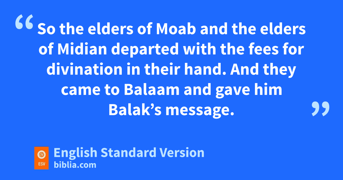 7 So the elders of Moab and lthe elders of Midian departed with pthe fees for divination in their hand. And they came to Balaam and gave him Balak’s message. 8 And he said to them, “Lodge here tonight, and I will bring back word to you, as the Lord speaks to me.” So the princes of Moab stayed with Balaam. 9 qAnd God came to Balaam and said, “Who are these men with you?” 10 And Balaam said to God, “Balak the son of Zippor, king of Moab, has sent to me, saying, 11 ‘Behold, a people has come out of Egypt, and it covers the face of the earth. Now come, curse them for me. Perhaps I shall be able to fight against them and drive them out.’ ” 12 God said to Balaam, “You shall not go with them. You shall not curse the people, for rthey are blessed.” 13 So Balaam rose in the morning and said to the princes of Balak, “Go to your own land, for the Lord has refused to let me go with you.” 14 So the princes of Moab rose and went to Balak and said, “Balaam refuses to come with us.”