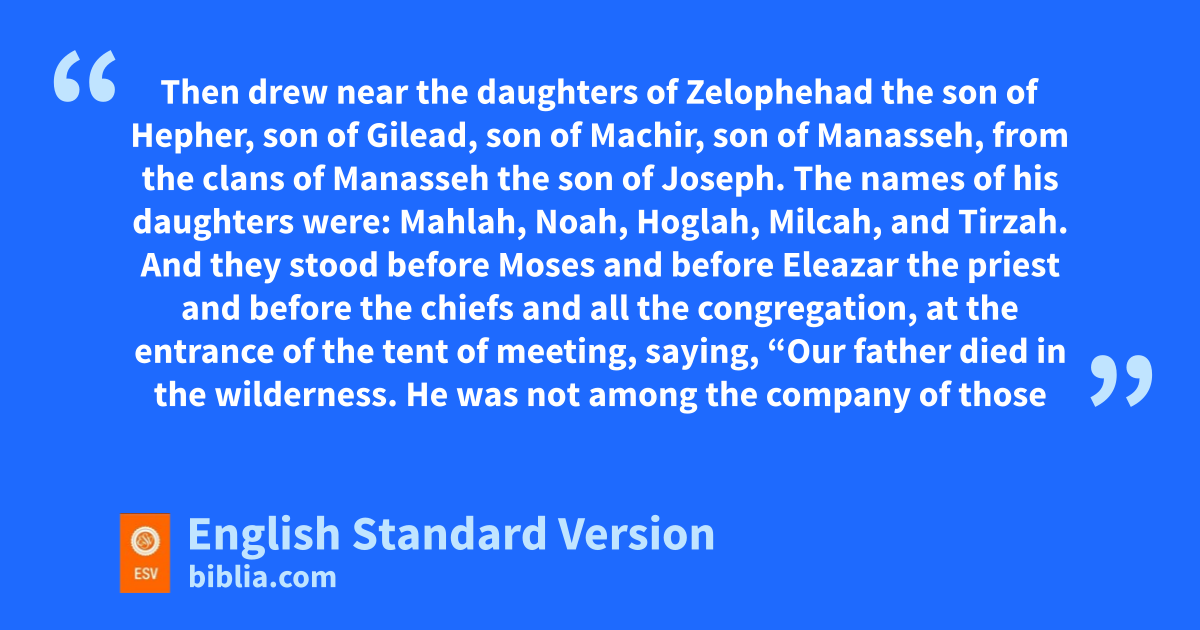 27 Then drew near the daughters of xZelophehad the son of Hepher, son of Gilead, son of Machir, son of Manasseh, from the clans of Manasseh the son of Joseph. The names of his daughters were: Mahlah, Noah, Hoglah, Milcah, and Tirzah. 2 And they stood before Moses and before Eleazar the priest and before the chiefs and all the congregation, at the entrance of the tent of meeting, saying, 3 “Our father ydied in the wilderness. He was not among the company of those who gathered themselves together against the Lord zin the company of Korah, but adied for his own sin. And he had no sons. 4 Why should the name of our father be taken away from his clan because he had no son? bGive to us a possession among our father’s brothers.”