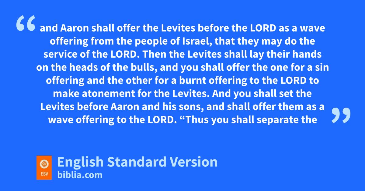 5 And the Lord spoke to Moses, saying, 6 “Take the Levites from among the people of Israel and cleanse them. 7 Thus you shall do to them to cleanse them: sprinkle the jwater of purification upon them, and klet them go with a razor over all their body, and wash their clothes and cleanse themselves. 8 Then let them take a bull from the herd and lits grain offering of fine flour mixed with oil, mand you shall take another bull from the herd for a sin offering. 9 nAnd you shall bring the Levites before the tent of meeting oand assemble the whole congregation of the people of Israel. 10 When you bring the Levites before the Lord, the people of Israel pshall lay their hands on the Levites, 11 and Aaron shall offer the Levites before the Lord as a wave offering from the people of Israel, that they may do the service of the Lord. 12 Then the Levites qshall lay their hands on the heads of the bulls, and you shall offer rthe one for a sin offering and the other for a burnt offering to the Lord to make atonement for the Levites. 13 And you shall set the Levites before Aaron and his sons, and shall offer them as sa wave offering to the Lord.