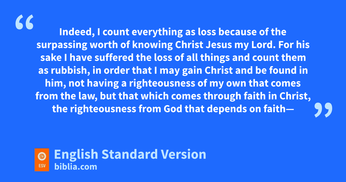 2 Look out for mthe dogs, look out for nthe evildoers, look out for those who mutilate the flesh. 3 For owe are the circumcision, pwho worship qby the Spirit of God2 and rglory in Christ Jesus and put no confidence in the flesh— 4 sthough I myself have reason for confidence in the flesh also. If anyone else thinks he has reason for confidence in the flesh, I have more: 5 tcircumcised on the eighth day, uof the people of Israel, vof the tribe of Benjamin, ua Hebrew of Hebrews; as to the law, wa Pharisee; 6 xas to zeal, ya persecutor of the church; zas to righteousness under the law,3 blameless. 7 But awhatever gain I had, bI counted as loss for the sake of Christ. 8 Indeed, I count everything as loss because of cthe surpassing worth of dknowing Christ Jesus my Lord. For his sake I ehave suffered the loss of all things and count them as rubbish, in order that I may gain Christ 9 and be found in him, not having fa righteousness of my own that comes from the law, but gthat which comes through faith in Christ, the righteousness from God that depends on faith— 10 hthat I may know him and ithe power of his resurrection, and jmay share his sufferings, becoming like him in his death, 11 that by any means possible I may kattain the resurrection from the dead.