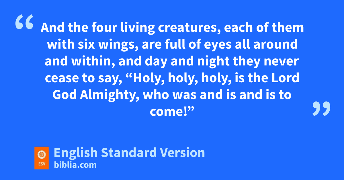 And around the throne, on each side of the throne, are tfour living creatures, ufull of eyes in front and behind: 7 vthe first living creature like a lion, the second living creature like an ox, the third living creature with the face of a man, and the fourth living creature like an eagle in flight. 8 And the four living creatures, weach of them with six wings, are xfull of eyes all around and within, and yday and night they never cease to say,