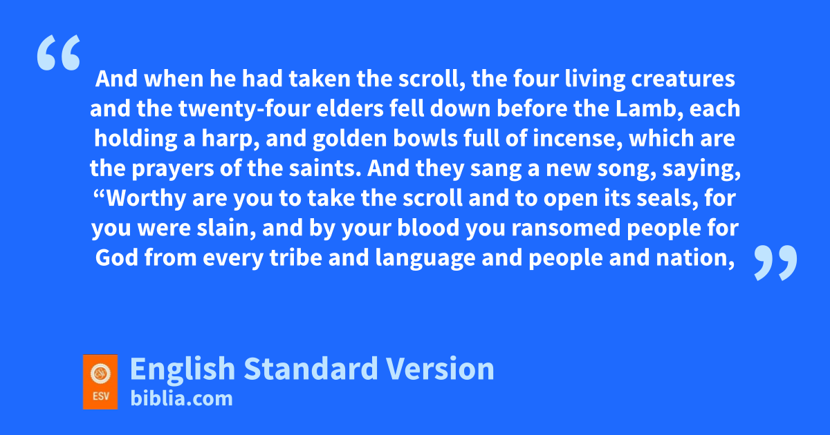 6 And between the throne and the four living creatures and among the elders I saw na Lamb standing, as though it had been slain, with seven horns and with oseven eyes, which are pthe seven spirits of God sent out into all the earth. 7 And he went and took the scroll from the right hand of him who was seated on the throne. 8 And when he had taken the scroll, the four living creatures and the twenty-four elders qfell down before the Lamb, reach holding a harp, and sgolden bowls full of incense, twhich are the prayers of the saints. 9 And they sang ua new song, saying,