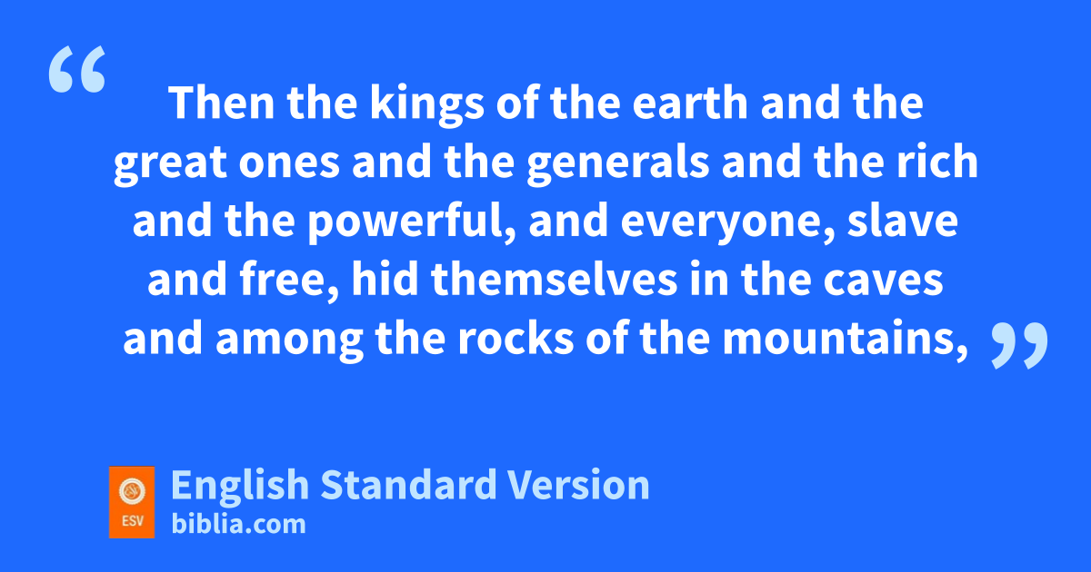 12 When he opened the sixth seal, I looked, and behold, ithere was a great earthquake, and jthe sun became black as ksackcloth, the full moon became like blood, 13 and lthe stars of the sky fell to the earth mas the fig tree sheds its winter fruit when shaken by a gale. 14 nThe sky vanished mlike a scroll that is being rolled up, and oevery mountain and island was removed from its place. 15 Then the kings of the earth and the great ones and the generals and the rich and the powerful, and everyone, slave5 and free, phid themselves in the caves and among the rocks of the mountains, 16 qcalling to the mountains and rocks, “Fall on us and hide us from the face of rhim who is seated on the throne, and from the wrath of the Lamb, 17 for sthe great day of their wrath has come, and twho can stand?”