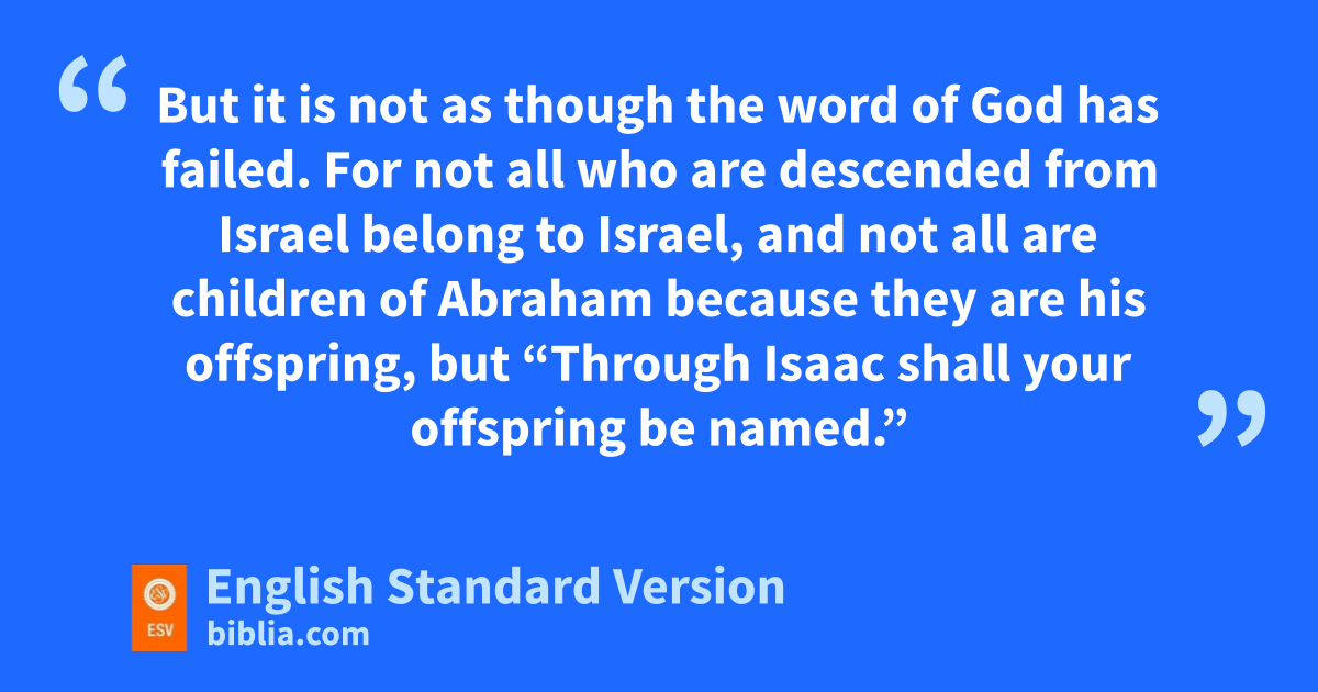 6 But it is not as though the word of God has failed. For not all who are descended from Israel belong to Israel, 7 and not all are children of Abraham obecause they are his offspring, but p“Through Isaac shall your offspring be named.” 8 This means that it is not the children of the flesh who are the children of God, but qthe children of the promise are counted as offspring. 9 For this is what the promise said: r“About this time next year I will return, and Sarah shall have a son.” 10 And not only so, but salso when Rebekah had conceived children by one man, our forefather Isaac, 11 though they were not yet born and had done nothing either good or bad—in order that God’s purpose of election might continue, not because of works but because of thim who calls— 12 she was told, u“The older will serve the younger.” 13 As it is written, v“Jacob I loved, but Esau I hated.”