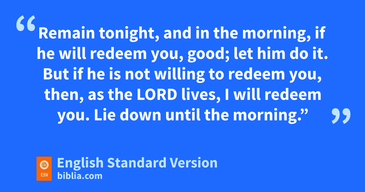 6 So she went down to the threshing floor and did just as her mother-in-law had commanded her. 7 And when Boaz had eaten and drunk, and ohis heart was merry, he went to lie down at the end of the heap of grain. Then she came softly and uncovered his feet and lay down. 8 At midnight the man was startled and turned over, and behold, a woman lay at his feet! 9 He said, “Who are you?” And she answered, “I am Ruth, your servant. pSpread your wings1 over your servant, for you are qa redeemer.” 10 And he said, r“May you be blessed by the Lord, my daughter. You have made this last kindness greater than sthe first in that you have not gone after young men, whether poor or rich. 11 And now, my daughter, do not fear. I will do for you all that you ask, for all my fellow townsmen know that you are ta worthy woman. 12 And now it is true that I am ua redeemer. Yet there is a redeemer nearer than I. 13 Remain tonight, and in the morning, if he will vredeem you, good; let him do it. But if he is not willing to redeem you, then, was the Lord lives, I will redeem you. Lie down until the morning.”