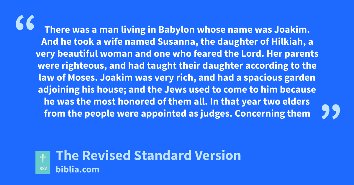 1 There was a man living in Babylon whose name was Joakim. 2 And he took a wife named Susanna, the daughter of Hilkiah, a very beautiful woman and one who feared the Lord. 3 Her parents were righteous, and had taught their daughter according to the law of Moses. 4 Joakim was very rich, and had a spacious garden adjoining his house; and the Jews used to come to him because he was the most honored of them all.