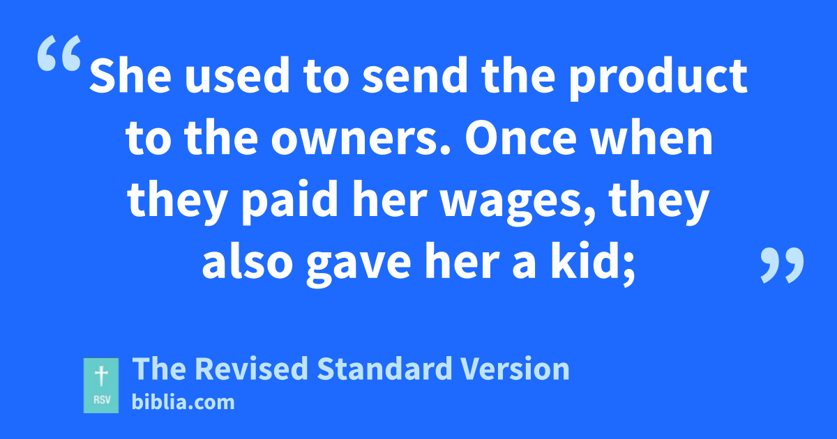 11 Then my wife Anna earned money at women’s work. 12 She used to send the product to the owners. Once when they paid her wages, they also gave her a kid; 13 and when she returned to me it began to bleat. So I said to her, “Where did you get the kid? It is not stolen, is it? Return it to the owners; for it is not right to eat what is stolen.” 14 And she said, “It was given to me as a gift in addition to my wages.” But I did not believe her, and told her to return it to the owners; and I blushed for her. Then she replied to me, “Where are your charities and your righteous deeds? You seem to know everything!”