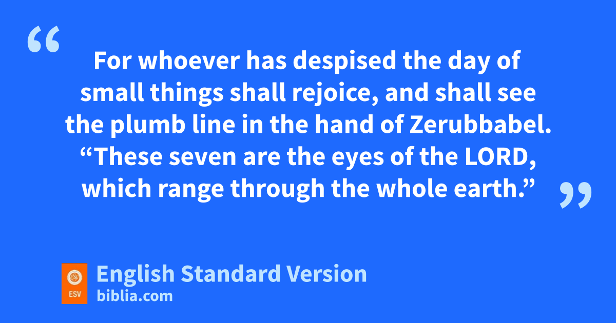 8 Then the word of the Lord came to me, saying, 9 q“The hands of lZerubbabel have laid the foundation of this house; his hands shall also rcomplete it. sThen you will know that the Lord of hosts has sent me to you. 10 tFor whoever has despised the day of small things shall rejoice, and shall see uthe plumb line in the hand of Zerubbabel.